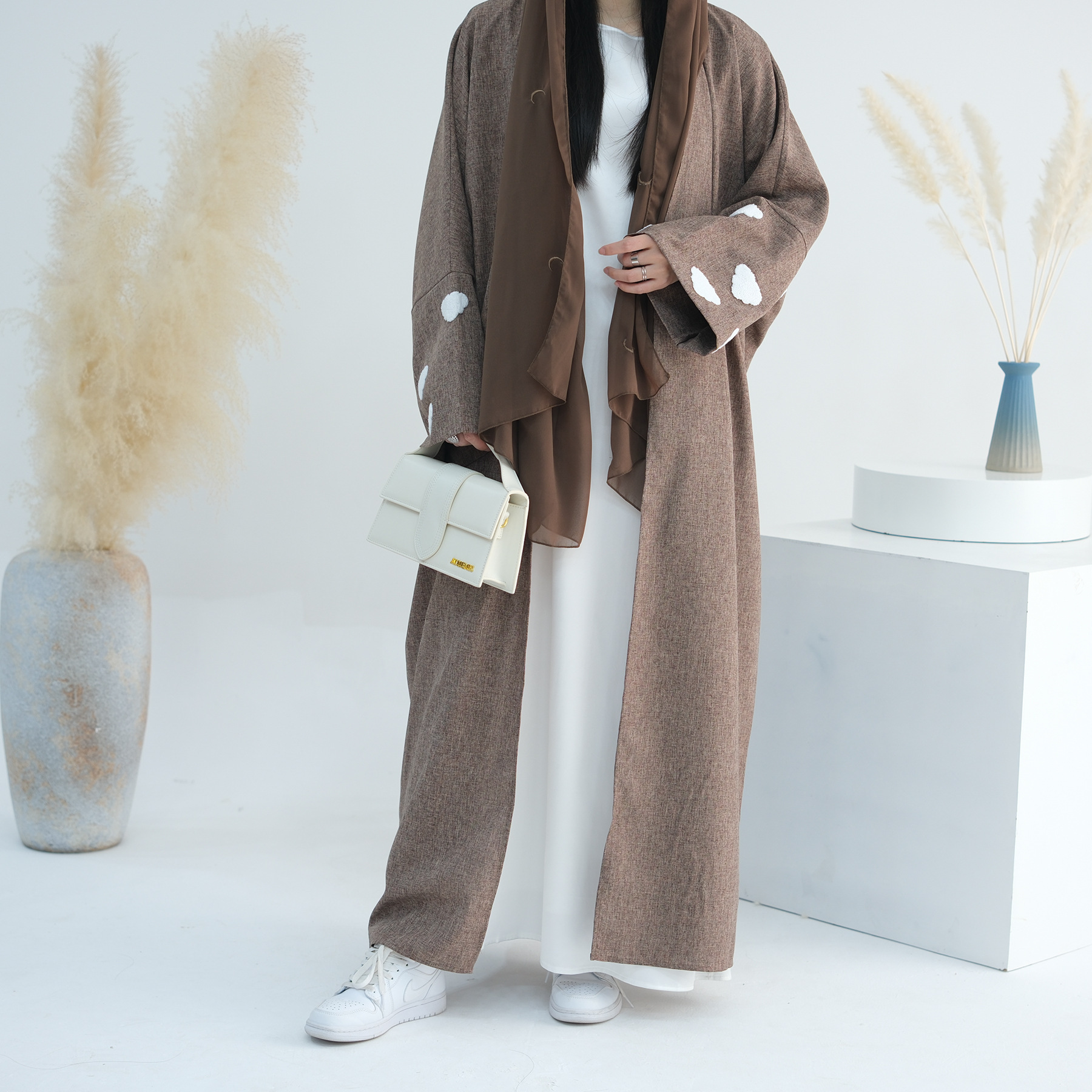 Color: gray, brown, gray chiffon scarf, brown chiffon scarf